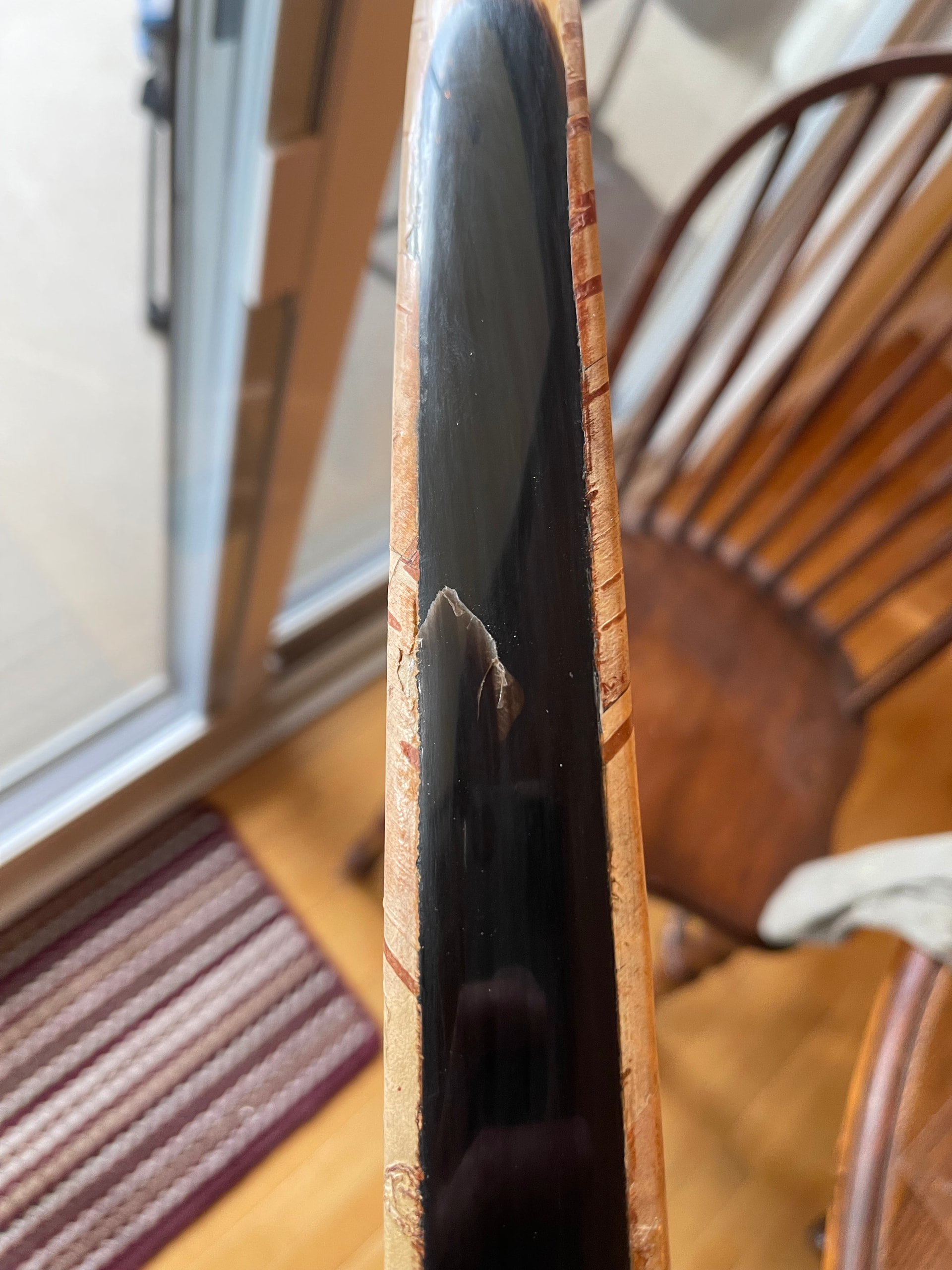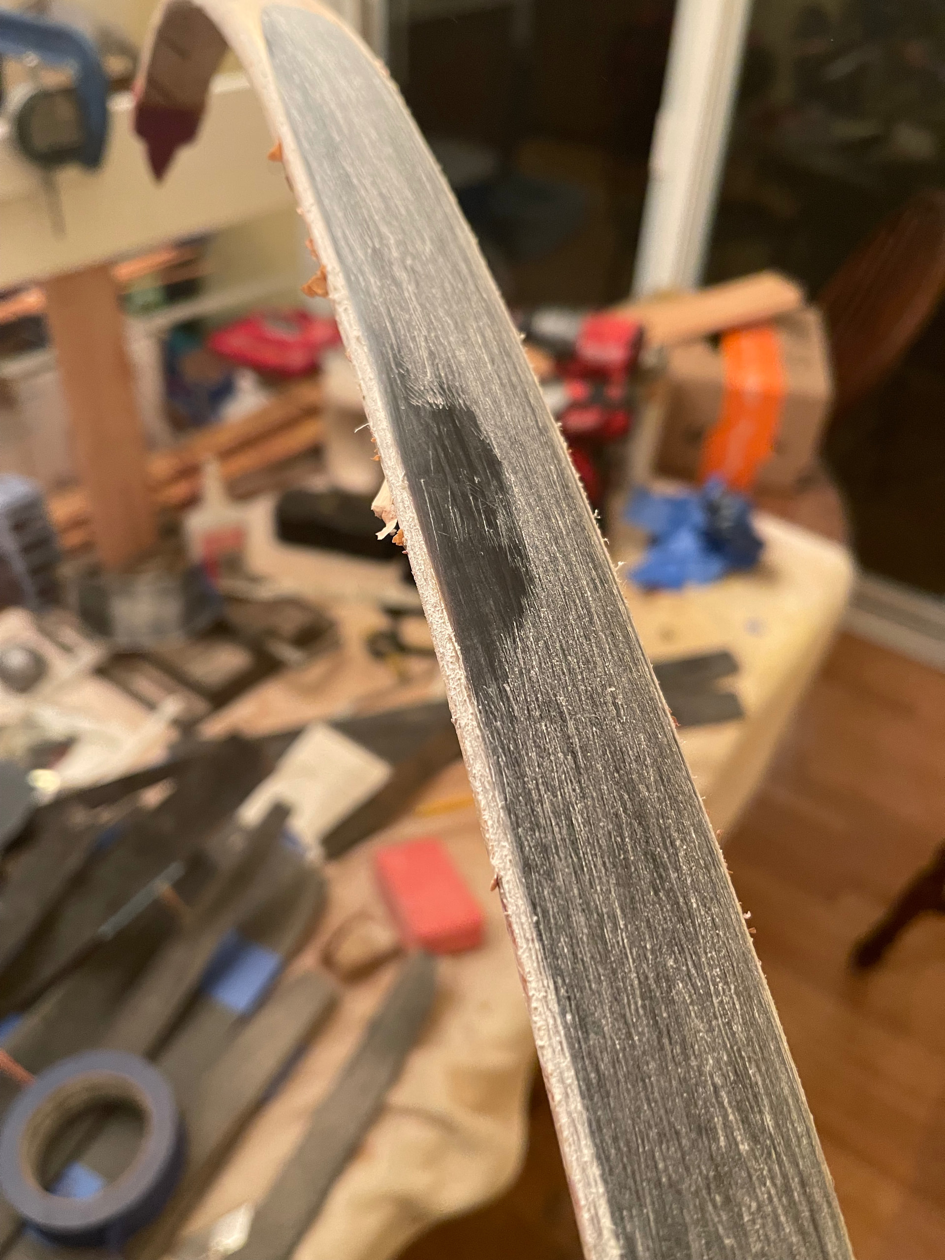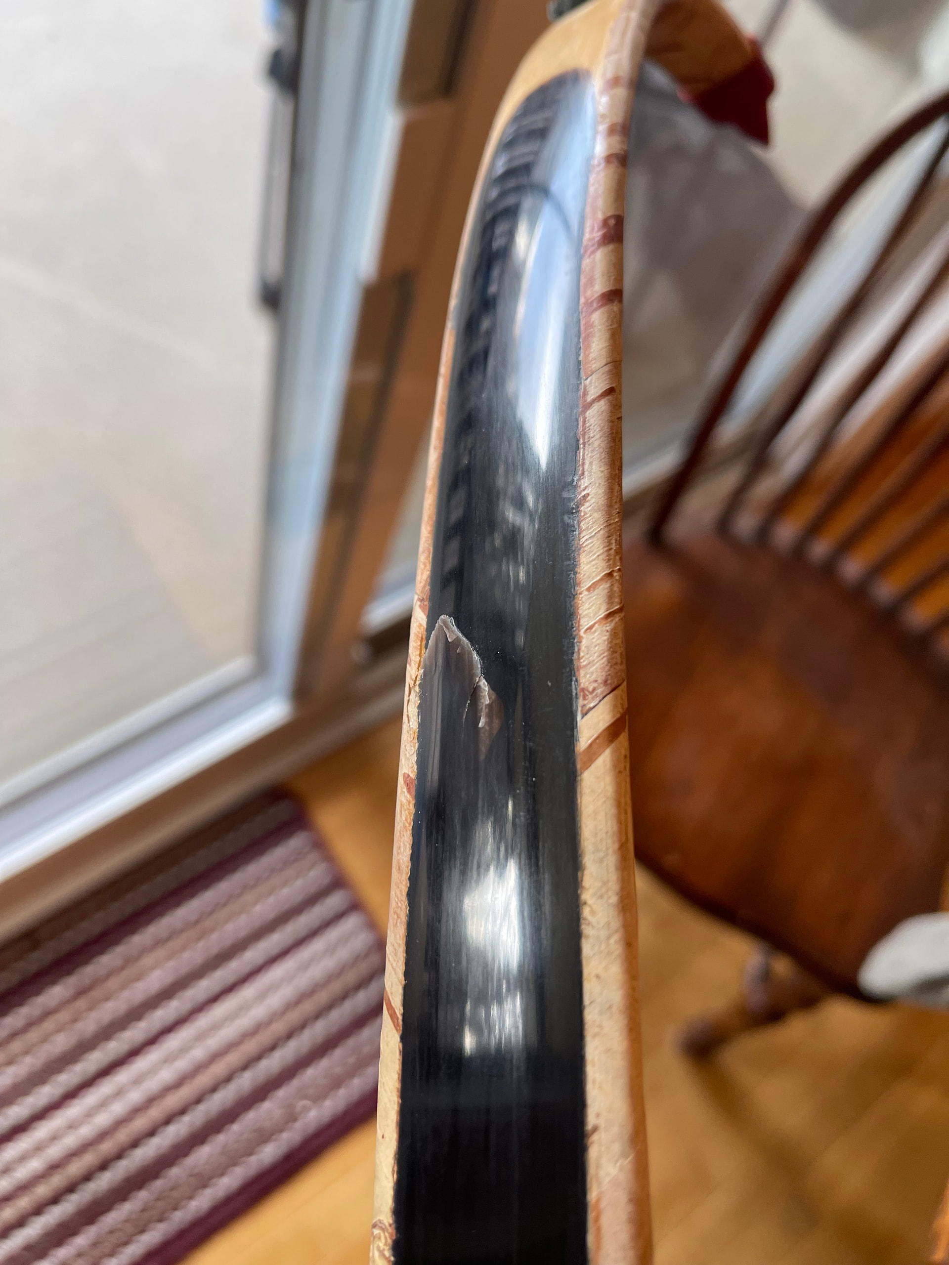 Yes. I agree with what you’ve said. I think this one may have been doomed due to the crack that I knew was there from the start. I went against my better judgement and decided to proceed anyway. The dryness Likely didn’t help either. I get my humidity in the house the last month or so around 50%. I’m already filing down the horn this morning and having a post mortem. It seems that it’s just surface crack delaminate within the section outer layer of the horn. So it may be that I can just lighten up the bow and scrape for say a 50lb instead of 70lb. Or I just rasp it all off and replace it. I’ll know better when I do more here. You can see the little dip in the horn as I worked it down some. Still a little more to go. Thanks for the insight and wisdom.