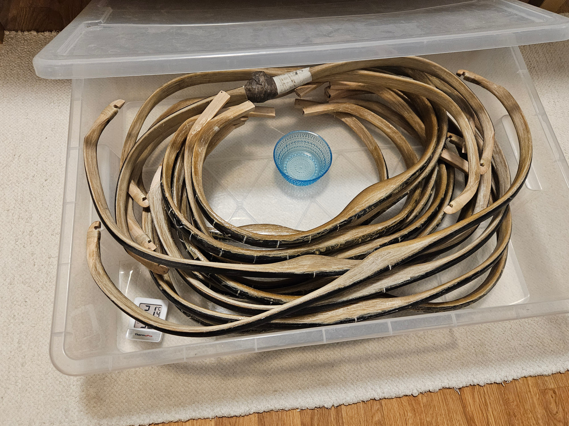 I like that idea with the tote and cup of water and the meter too. I’m gona do that I think. The day that I test shot my Korean style bow it was a very hot humid day so it bent and balanced nicely then. In Alberta here it’s quite dry. I find that I have to wrap my sinew to keep from drying too fast. lol. I burnished my top layer on my Turkish style bows after about a week or so after to help compress it good in case it dried too fast on very top layer. We will see if that was a good idea or not. I’m hoping my Turkish bows will be good to go for august. I’ll pick a nice hot day and use your idea with moisture tote before I get bending them.